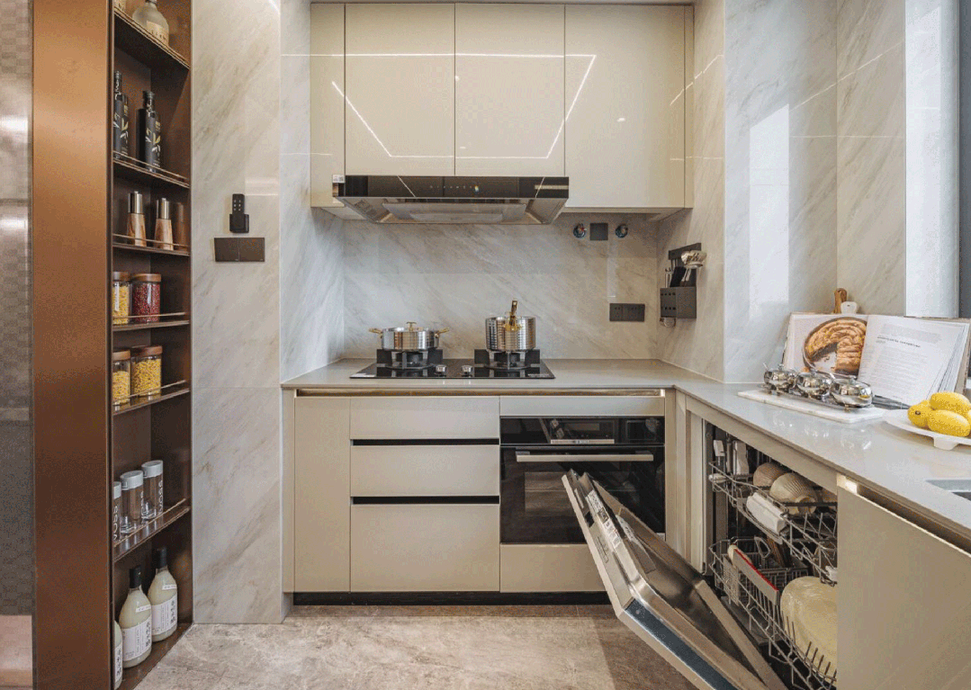 正在交付配套之中高阶定制餐柜空间,卑贱豪情不自禁。例如面材采用防油膜更便于洁净 。