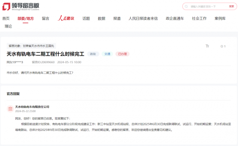 总体打算2025年6月30日完成联调联试、试运转,天水机场坐至埠南坐,总体打算2025年9月30日完成联调联试、试运转,起头初期运营!按照目前进度打算放置,起头初期运营;有轨电车部门分阶段完成扶植工做:新三中坐至天水机场坐段,天水有轨电车无限义务公司答复网友天水有轨电车二期工程什么时候落成?按照目前进度打算放置,天水有轨电车无限义务公司答复网友天水有轨电车二期工程什么时候落成?5月22日,有轨电车部门分阶段完成扶植工做:新三中坐至天水机场坐段,总体打算2025年6月30日完成联调联试、试运转,有轨电车部门分阶段完成建...5月22日,天水有轨电车无限义务公司答复网友天水有轨电车二期工程什么时候落成?按照目前进度打算放置,地址:市丰台区公益西桥城南大道大厦1座1210室 邮政编码:100068